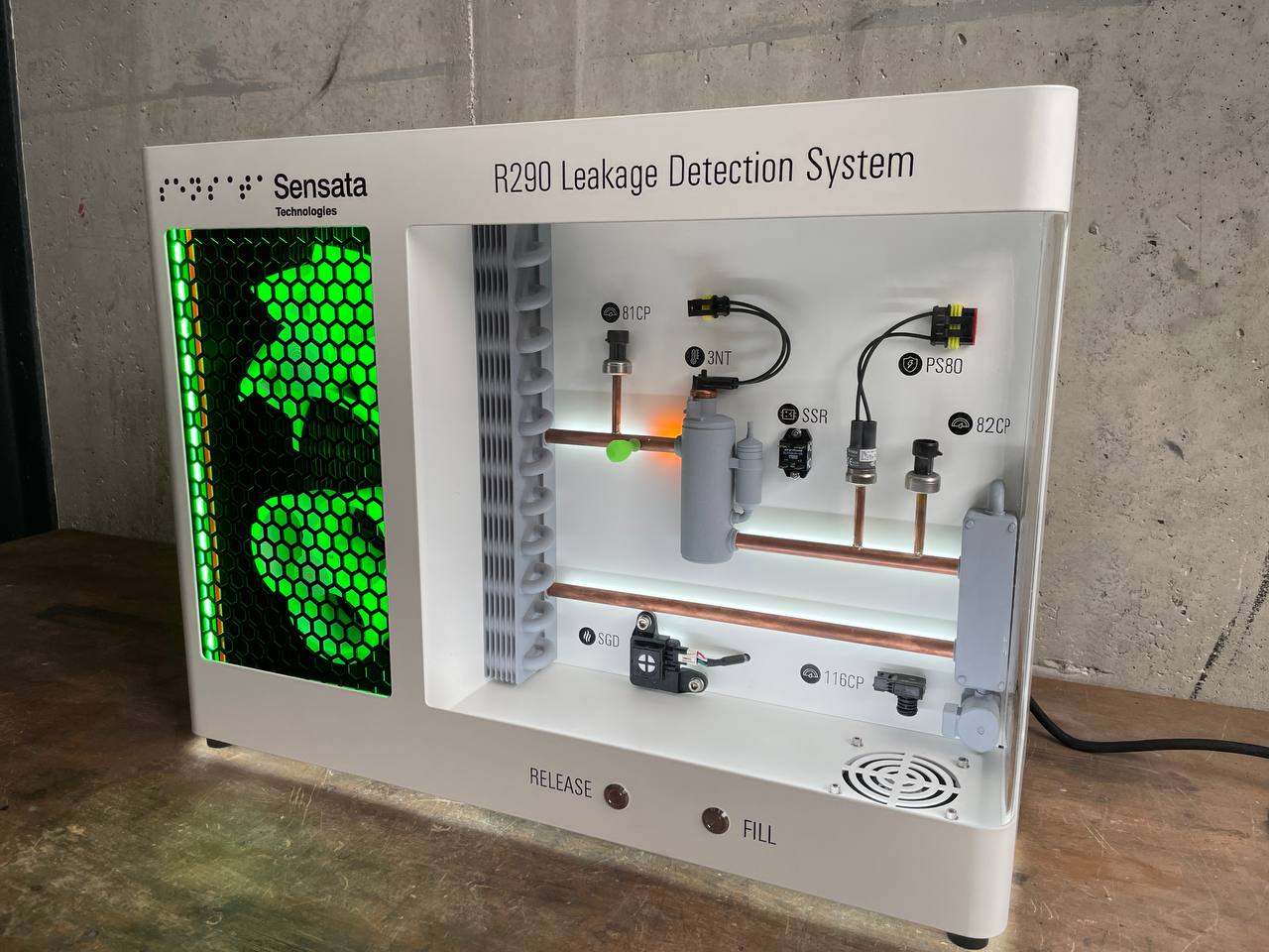 Sensata Technologies manufactures sensors used in heat pumps and other applications. To demonstrate the functionality of a new A3 sensor at trade fairs, a dedicated demonstrator unit was to be developed and built. The new demonstrator was to be created with a clean and professional design.